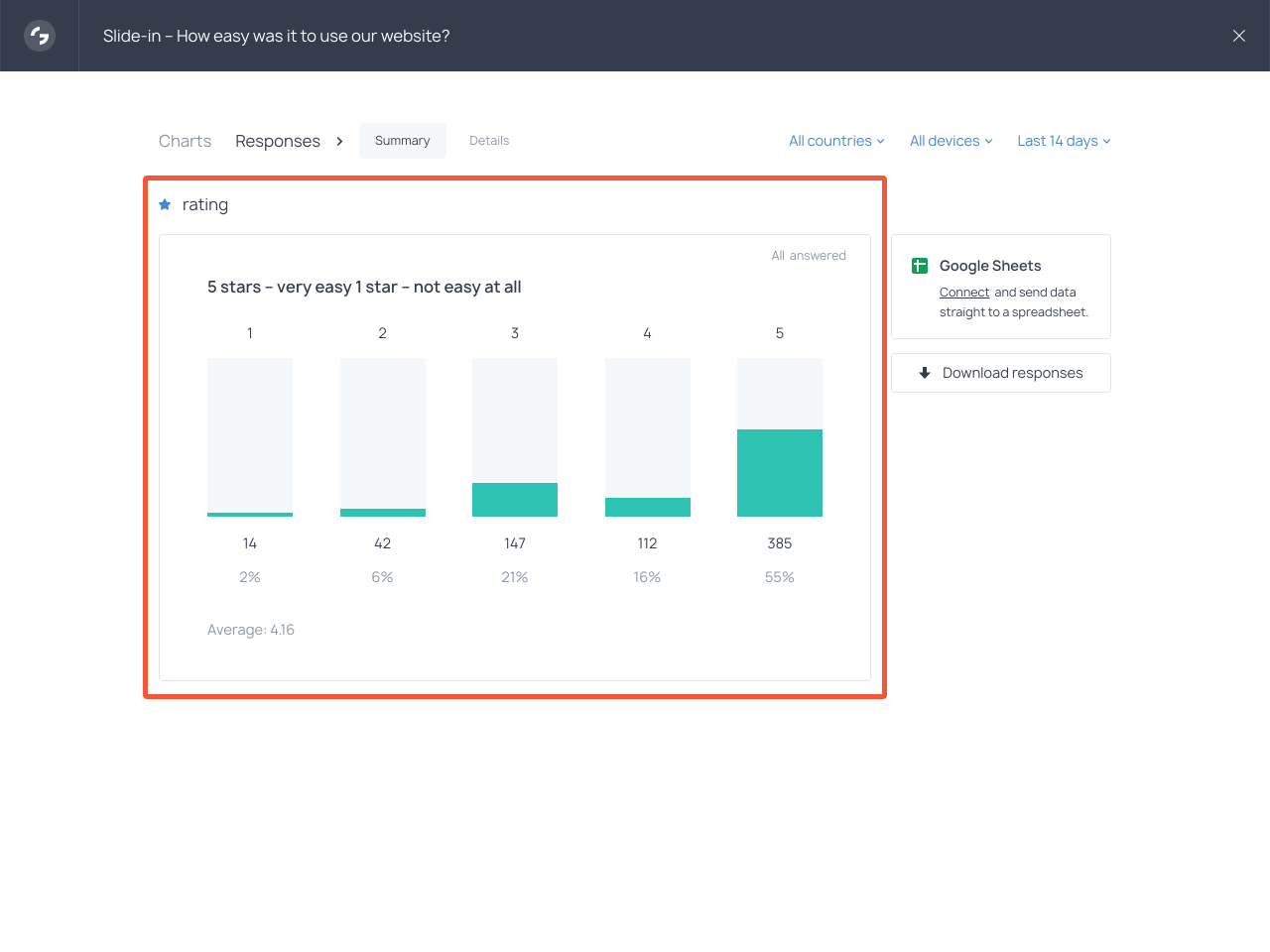 The performance report allows you to see the average rating as well as a more detailed breakdown, plus an overview of the responders: their location, device, UTM, and some other parameters.