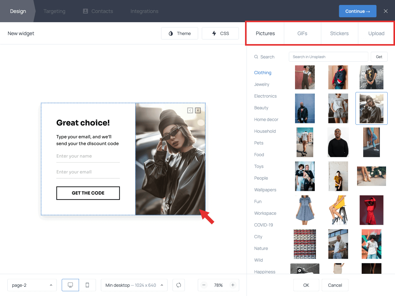 To replace the image, click on it and choose a stock photo from the gallery or upload your own; then do the same for the second page of the popup.