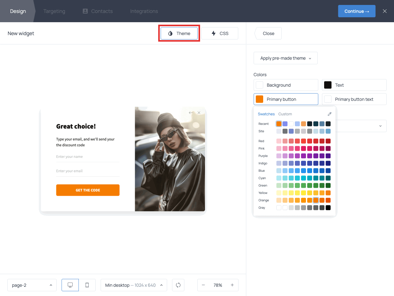 To customize the color palette, field style, or font on the popup, use the Theme menu at the top. These changes are applied to both pages automatically.
