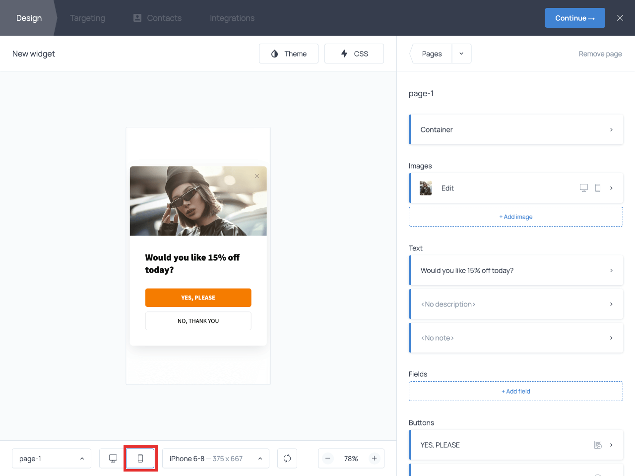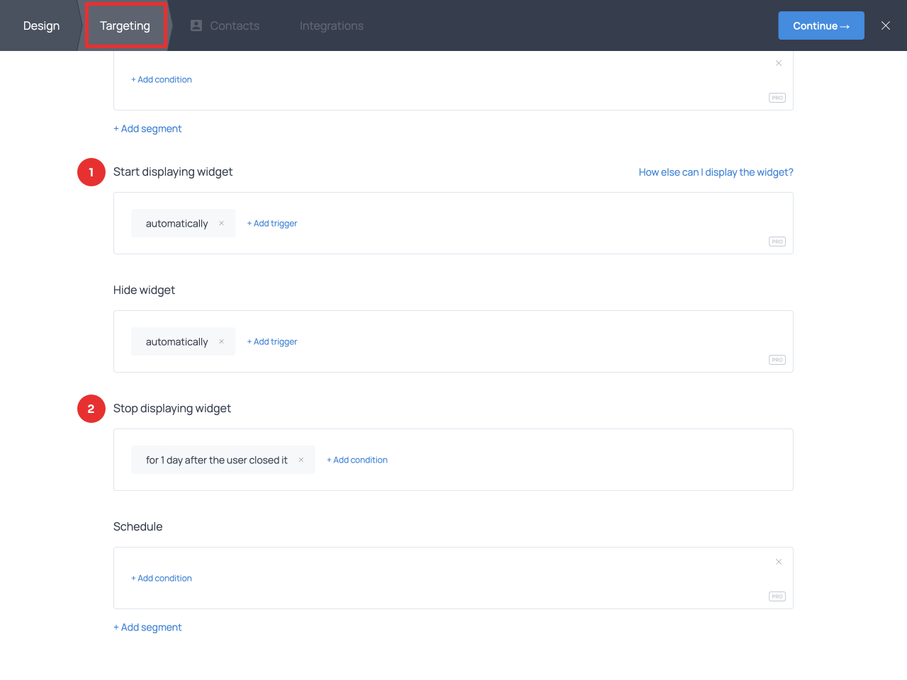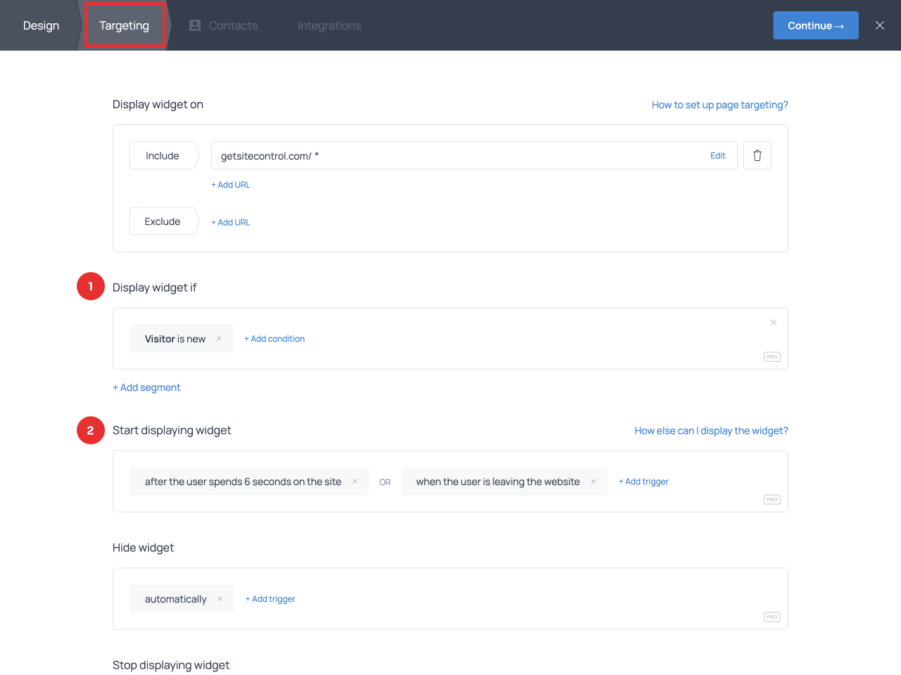 When you’re done designing the popup, click Continue → to move to the Targeting tab to define who will see the popup and when.
