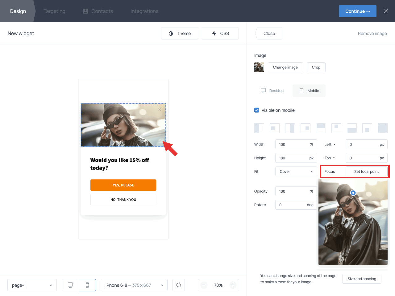 Make sure the offer text fits within the screen, the button text stays on one line, and the image is properly positioned. If you need to adjust image placement, click the image in mobile preview mode, go to Focus → Set focal point, and drag the control to find the best framing.