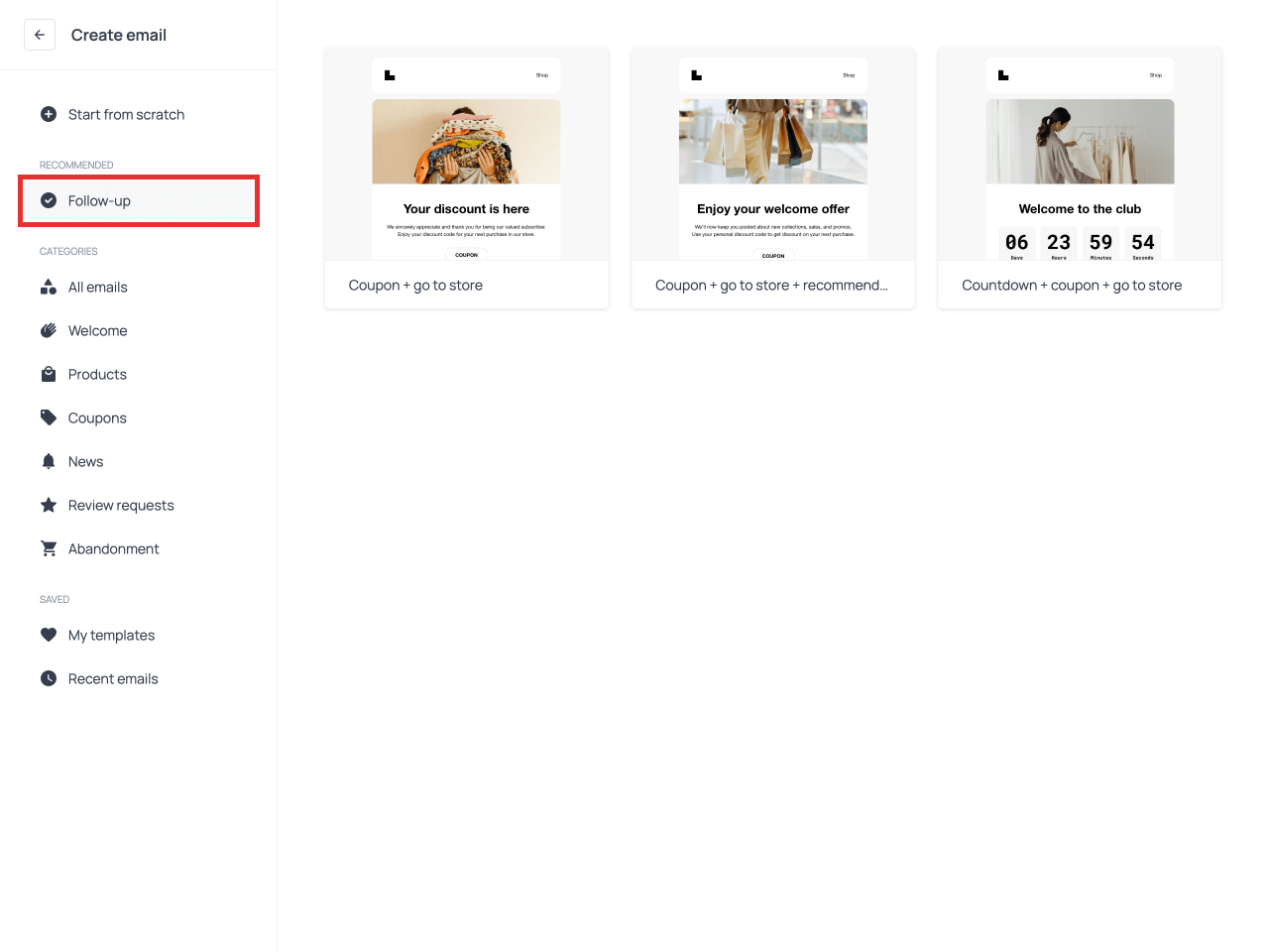 Select one of the pre-designed Follow-up emails keeping in mind that you’ll be able to fully customize them by replacing images, adding buttons and aligning the design with your branding.