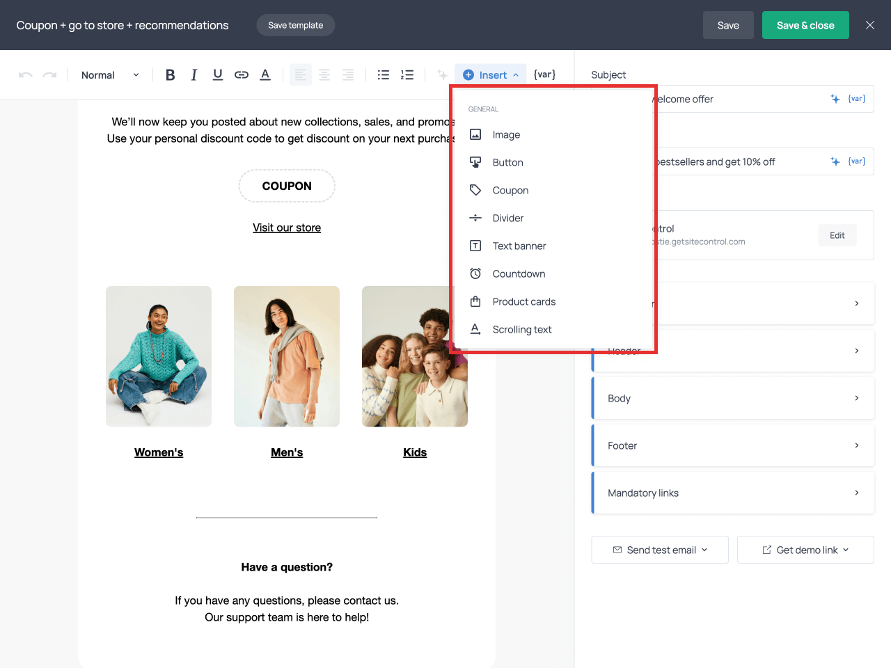 Customize the email and add engagement elements like coupons, buttons, and countdown timers from the +Insert menu.