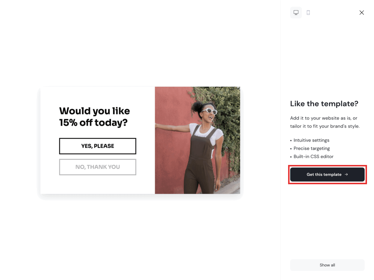 To recreate exactly the same popup as you’ve seen at the beginning of this guide, click on the template below. This template already includes a Yes or No form logic — you’ll just need to personalize the design.