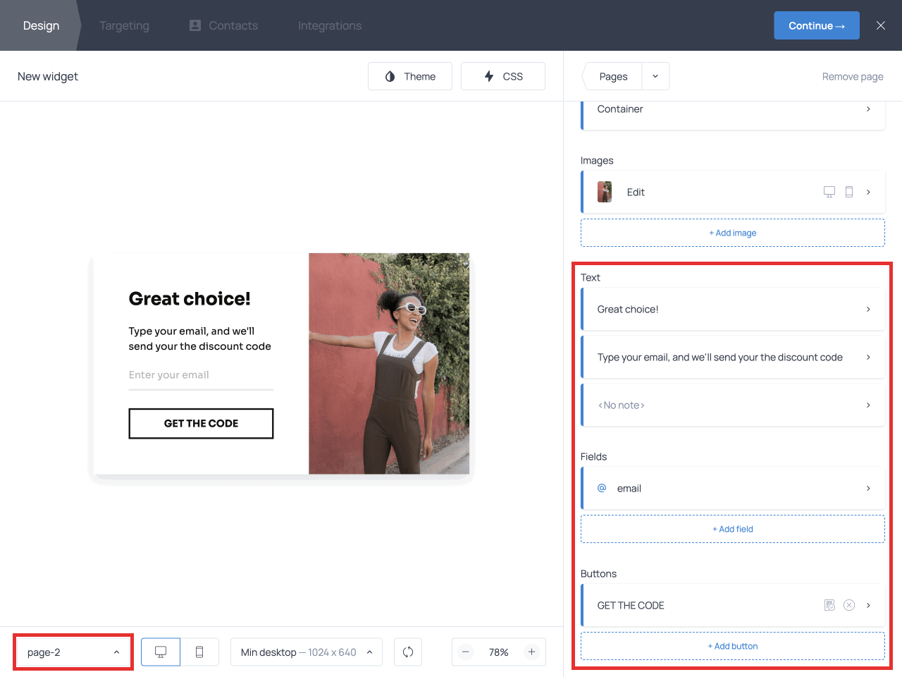 Since it’s a pre-designed template, the second page already contains default text and an email capture field. Сustomize it by taking the steps described earlier: use the right-hand menu to edit the title, description, and button text.